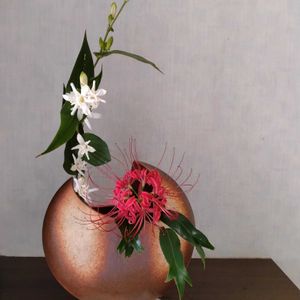 今日の庭から 庭の花を生ける✊ 白花ホトトギス、ヒガンバナ咲いてます。 彼岸花を生けるのは初めてです。 実は今まで抵抗があって、生けたことがなかったんですけど、どうでしょうか🤔 金魚葉椿の葉を添えました 花器は変わった形なので、毎回苦戦します🤭