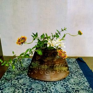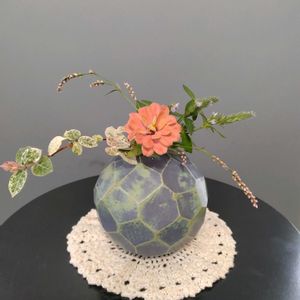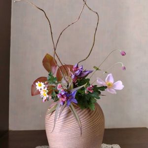 今日の庭から 庭の花を生ける✊ 先日、バサーでこの花器をゲットしました。 木目のように見える陶器製です。 出自不明😅 リンドウ、小菊、ピンクのシュウメイギク、雲龍柳、ブルーベリーの葉