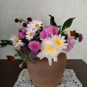 今日の庭から 庭の花を生ける✊ 挿し木で増やした菊達です😉 金魚葉椿の葉を足しました。 花器は先日バサーでゲットしたものです。
