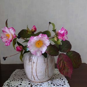 今日の庭から 庭の花を生ける✊ サザンカが綺麗に咲いています。 ブラックベリーの葉とシロヤマブキの実を合わせましたよ~😃 花器は以前益子の陶器市で買ったものです。口の部分が変形しています。