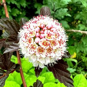手毬状の花と葉色の美しさが魅力的な アメリカテマリシモツケ・サマーワイン 別名 赤葉コデマリ 花言葉 「努力」 🏷️金曜日の蕾たち 参加させて頂きます 素敵なGWをお過ごし下さい 2023・5・5 大島小松川公園