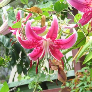 綺麗な「ユリ」に出会えました。 パチリ Googleレンズで調べると「カノコユリ」と提案がありましたが、花弁の全体が赤ピンクのためただの「ユリ」としました。