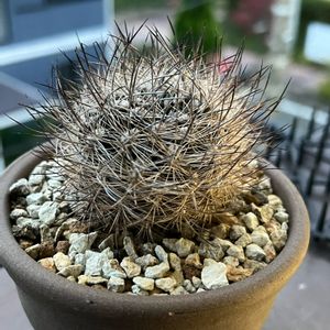 おはようございます☀ 今日も青空が広がり暑くなりそう いいお天気が続いております🌷 こちらのサボテン 頂点部分の棘は黒く長い棘で覆われて 本体があまり見えないが 園芸店で目にとまり購入しました✨ サボテンもじわじわと増えつつあります😅 こちらは銀翁玉ちゃんでございます🌵