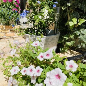猛暑にも台風にも負けなかったPWスーパーチュニアビスタ シルバーベリー ペンタスシリウス ソラもよく咲き続けてます(•ө•)♡