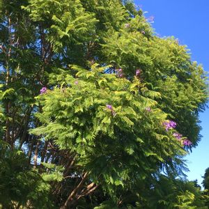 わっさわっさモリモリジャカランダ葉🌿 おやおや👀✨✨✨ 季節外れにちょっとだけ花が💟笑っ 友達の横の家の大木🌳こんな立派なジャカランダがおうちにあるの羨ましいゾ〜❤︎