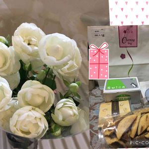 娘が買ってきてスプレーバラ🌹。白くてカーネションみたいな優しいバラです。セールしてたと言ってお菓子詰め合わせも買って来きてくれました。^o^