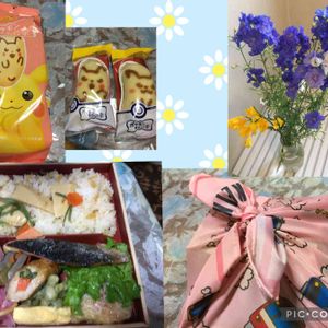 今日のお昼は、京急電鉄コラボ花見弁当。電車🚃の柄のピンクの布のチーフ付き。デザートはピカチュウコラボの東京バナナです。桜🌸は終わってしまったので娘が買って来たデルフィニウムを見ながら食べました。^o^