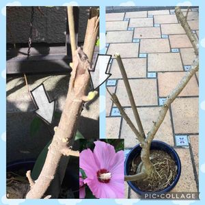 右、昨年、芙蓉がフェンスから家の横の歩道に大きく出っ張ってしまったので強く剪定しすぎ棒になってしまいました。左、今年、さすがに枯れてしまうかと思ったら、小さな芽が出て来て一安心です^o^。でも花🌸は無理かな?狭い庭なので育ち過ぎても悩みの種です。