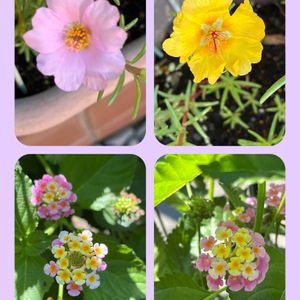 おはようございます。晴れ、30.6℃、10:00ジリジリ暑い。八重松葉ぼたん2世114日目ピンク&イエローが咲きました。ランタナ、日陰で涼しく咲いてます。😻🥰😍😸😋☺️