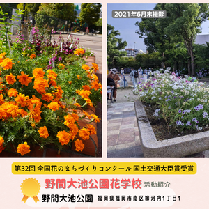 【広い花壇を水やりなしでメンテナンス】 福岡市南区にある野間大池公園。 多くの方の憩いの場になっている、この公園の花壇は「野間大池公園花学校」の皆さんがお世話をしており、この度、会の活動が評価され、第32回全国花のまちづくりコンクールにて国土交通大臣賞を受賞されました。 こだわりは「いつでも花が咲いている」。そして「いかに手をかけずに花壇を維持していくか」 花壇のお花は毎年の気候に左右されます。また、広大な敷地なの でお手入れも大変! だからこそ、この2つのこだわりを重視しているのです。 宿根草、一年草、コニファー(針葉樹)で花壇は構成されており、苗を植えた時に水をあげますが、それ以降は水をあげません。 水をあげてしまうと、どうしても「やりぐせ」がついてしまいます。 お花の元気がなくなっても、ぐっと我慢。 植物はどんどん下に根を張り、水をあげなくても育ってくれるのです。 2008年、「植え付けた時以外は水やりをしない」というコンセプトで作られた英国のベス・チャトー ガーデンがテレビで紹介され、それをヒントに方法で花壇を維持しています。 宿根草はとても強く、毎年春に花を咲かせてくれます。 また、一年草は少し弱い品種もあるので、試行錯誤しながら植えています。 フレンチマリーゴールド、アフリカンマリーゴールド、ジャーマンアイリスなどを植えています。 緑のコニファーを植えることで雑草が生えにくくなります。 また、緑の色の種類を増やすことで、花壇に奥行きが出て、沢山緑があればどうしても花が少ない真夏日や真冬日でも花壇がきれいに見えます。 ぜひ、工夫がたくさんの花壇を見に行ってくださいね! 長住1丁目のバス停を降りてすぐの入り口から入った花壇が特におすすめです! また、野間大池公園花学校は日曜日と火曜日に活動をしています! 団体の詳細はこちら! https://www.midorimachi.jp/help/group.php?id=39
