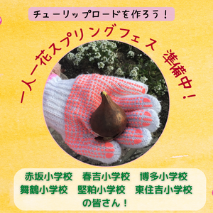 【一人一花スプリングフェスに向けて準備中】 毎年4月に行われている「一人一花スプリングフェス」は、九州新幹線鹿児島ルート全線開通をきっかけにスタートした事業です。 期間中は様々な花に関わるイベントが開催されるとともに、博多駅〜舞鶴公園をつなぐルート沿いに約5万本のチューリップや季節の花々が咲き誇る、チューリップロードが誕生します。 そのチューリップロードの準備として、12月中旬、福岡市内の小学校の児童の皆さんが、公園にチューリップの球根を植えてくれました! 参加してくれた皆さんはこちら! 【場所】舞鶴公園 赤坂小学校1年生、舞鶴小学校3年生の皆さん 【場所】清流公園 春吉小学校2年生、博多小学校3年生の皆さん 【場所】各校内 堅粕小学校2年生、東住吉小学校2年生の皆さん 今回からあらたに赤坂小学校の皆さんも参加されて、更にパワーアップ! 今年は緑のコーディネーターの方々が植え付けを児童の皆さんに教えてくださいました。緑のコーディネーターと児童の皆さんの交流も生まれ、和やかな雰囲気の中植え付け作業が行われました! 球根のどちら側を植えるかなど、丁寧に教えて頂き、児童の皆さん、先生たちも興味深々! 学校でも児童の皆さんはお花を植えたり野菜を植えたり土いじりを楽しんでいるということです。 チューリップの品種はミスティックバンエイク(ピンク)、アベルトン(赤)オックスエリート(赤黄)など! チューリップの見頃は4月上旬を予定しています。 (気温によっては3月下旬頃の可能性もあります) 市民・企業・団体の皆さんが冬の間に植え付けをし、大切に育ててきた花々の見頃がとても楽しみですね!