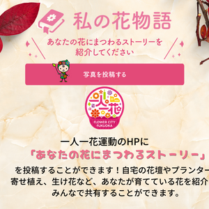 【一人一花運動をやってみよう 私の花物語】 一人一花運動の公式HPに「私の花物語」という投稿ページがあります! ここでは、自宅の花壇やプランター、寄せ植え、生け花など、育てている花を紹介してみんなで共有することができます。 例えば、こんな内容が投稿されています! ・私たち、こんな活動しています! ・私の自慢の花壇を紹介します! ・花づくりを通して地域の人たちと仲良くなった! ・この一輪の花にはこんなエピソードがあるんです! ・ここのお店の花壇はおしゃれなので紹介します! など、花づくりに関することならなんでも構いません。 ぜひお気軽に投稿してください! https://hitori-hitohana.city.fukuoka.lg.jp/prouds/add