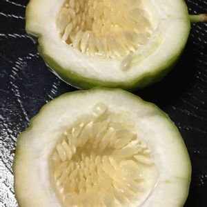 🍈パッションフルーツ 今回の大雨でどうやら枝から外れたみたいで、ネットの中で転がっていました 去年、熟して来るとポロって落ちるから、一つ一つにネット掛けてる方がいいよて、教えて頂いたので、掛けてたのですが、どうやら☔の重さで熟す前に枝から外れていました😫 切ってみたら、こんな感じでした まだ、青臭いだけでパッションフルーツのいい香りはしませんでした