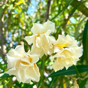 クリームイエロー八重のキョウチクトウを見つけました🌼 1度通り過ぎたのですが、やっぱり気になり帰り道に寄って撮りました📸✨ 半月前のことです。 一昨日、近くを通ったので「もっとたくさん咲いているかも🌼」とワクワクして見に行ってみましたが、お花はほとんど終わっていました😹 八重の子は繊細なのかな?暑すぎたのかな?まだ若い樹だったのかな? とにもかくにも、あのとき写真を撮っておいてよかったです☺️💕