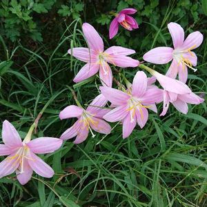 中央アメリカから、西インド諸島がげんさんです。 江戸時代の終わりに渡来しました。草原に生え、5センチから20センチになります。 葉は扁平なひも状です。 6月から9月ごろ、花茎を伸ばしてピンクの花を咲かせます。花は1日から3日ほど咲き続けます。 雨が降った後に開花することが多く [レインリリー]とも呼ばれます。 名では、(サフランもどき)です。 ⚫️ユリ科タマスダレ属の多年草です。 植物図鑑での解説です😝🙇♀️💕