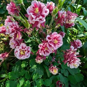 こんばんは☀️ ①西洋オダマキ💓🤍 ②お花畑の中にオダマキが咲いてました❢💛🤍 ③藤棚とイペ💜💛 ④⑤イペ💛💛