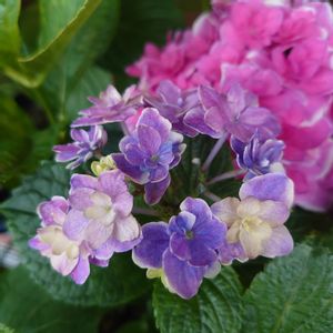 暁光園アジサイ「龍神」 何故か赤系と青系が同居して咲きました。 他の株も同じ。 そういう標準仕様? でも、暁光園さんから提供された花画像は 赤は赤、青は青でした。 いったい……我が家で育てた子に何があったんでしょう?
