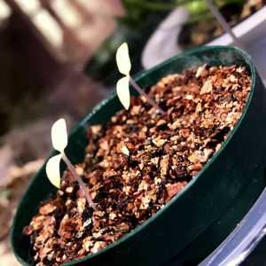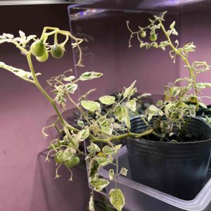 痛んで死にかけで手に入れた斑入りミニトマト 割とすぐ枯れ果ててしまったけど実はいくつか取れたので種を採り撒きしたら芽🌱が出たよ😚 双葉の色も薄いね〜 ちゃんと育つかなぁ🤔 観賞用で食べれないって書いてあったけど食べてみたら〜割と甘くて美味しかったよ🤗 ただ直径1cm以下なので食べでは無いね💦 たくさん採れたらサラダの彩り🥗程度かなぁ