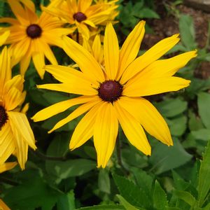 こんにちは~(∩´∀`∩)💕 今日は、少し曇っているせいか比較的涼しいので、午後は昨日の続きとして崖の紫陽花の剪定をする予定です。 最近、今ある車を売って新車を買った事もあって、車を売る側の会社と車を買う側の書類を揃えたり、交渉したりと忙しくてバタバタしてます💦 テレビで連日ニュースになっているB社のトラブルを聞いているので、我が家は別の会社との取り引きですが、車を渡すまではドキドキです。早く手放して安心したいなぁ。29日に引渡し予定なので、あと1週間…でも14年も共にした車。思い出はたくさんあるので、中の清掃もしてあげたいな^_^︎)ꕀ♡ 本日2枚目の投稿picは、ルドベキア フルギダ。 ずっと名前がハッキリと分からず、似ている花の名前を付けていましたが、やっと判明しました~(∩´∀`∩)💕(spring has comeさんが投稿してくれたおかげです) 7月3日にも載せたばかりですが、満開になったのと名前が判明した記念に載せました。過去にもたくさん投稿しているので、写真の中のタグから見てみて下さいね💕︎ 以下参考のため、Beginners Gardenさんのサイトから抜粋させていただきました。 ☆ルドベキア・フルギダは、匍匐枝(stoloniferous)で広がり、コンパクトな群生をつくり、毎年夏に黄色の花を咲かせる多年草タイプのルドベキアです。 花はキク科でよく見られる頭花で、頭花は直径7cmまで、舌状花と筒状花で構成されています。 筒状花は非常に小さく中央で50~500個以上が集まり円錐体をつくり、殆ど黒色に見える濃い茶色をしています。 殆ど黒色に見える筒状花は花弁との対比が美しく、警戒色のように強く目を引き付けます。 舌状花は長く水平に伸び鮮やかな黄色です。 ………途中省略……… ルドベキア・フルギダは夏の暑さ冬の寒さに強いです。 また地植えしている場合は水やりも肥料も基本的に不要になるため放ったらかしで育てる事も可能です ーーーーーーーーーーーーーーーーーーー 結構丈夫な野生児っぽいですね。うちでも、一時は、庭の1部で繁殖し過ぎて困るほどでしたが、今はアプローチに勝手に生えたものと、一部抜いて隣にあるベンチスペースの2つのベンチの間に植えてあります。手入れは全くしてないですが、毎年咲いてくれる丈夫なルドベキアです。 花びらが細くて繊細な感じでスッキリしている所も気に入ってます(∩´∀`∩)💕