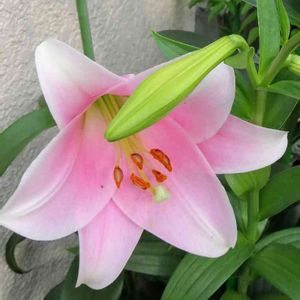 おはようございます🌞✋ 鉄砲ユリ✨ベルソングさん咲いてる~ 隣のトライアンファターさんの蕾が邪魔なの…😁 淡いピンクで優しいなぁ~🤗