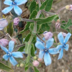 ルリトウワタ (ガガイモ科オキシペルム属) 南米ブラジル南部〜ウルグアイ原産 ブルースターという流通名で知られます 日当たりのいいあきちよ河川敷に生えます 茎には粗毛が生えていて白っぽく見えます 葉は基部が心形の長楕円型で 春から秋まての長期間葉腋から小さな空色の5弁のお花が小グループで咲きます花冠は星形花径2~3c 副花冠があり花中央にあって蕊が飛び出ています 花色は時間の経過と共に空色 濃青💙桃色💗 紫💜と変化して萎れます 別名 オキシペタラム カエルレウム ブルースター サザンスター 花言葉 幸福な愛