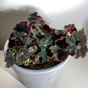 レックスベゴニア ダークマンボ ∈(°θ° )∋ 根腐れさせてしまった〜💧 植え替え〜💧 水はけの良い多肉土➕鹿沼😀 で、調べてたら、レックスベゴニア😳 葉っぱから芽が出てくるってよ😳 ホンマかいな😳 でもって、このダイソ〇鉢 水あげたら、めっちゃ色落ち💧 ホンマかいな😳 🏷かずのダークマンボ