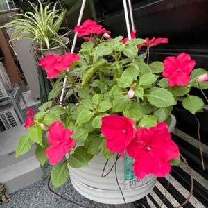 インパチェンス開花😊 春にハツユキカズラを植えていました😄 いつの間にか枯れ(鉢下に残骸ツル有り)😅 その後、何処からかインパチェンスの種が飛んできて、いい感じで咲いています😙 まっいいか🤣