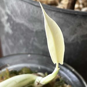 "ホワイトタイガー3兄弟" ついに1番目の茎だけ購入の子、開きました。 まっちろでした ちっさい、ペットボトルの蓋くらいのサイズ。 もう我慢できない、土に植え替えます!😂 次はもうちょい大きくなって緑入りますように🙏✨ 2番目の子は前の前の葉寄りの柄に近そうな、散り斑っぽい感じを確認🫡 3番目の子、まだ分かんないけどちゃんと緑入ってますね🥹👏👏