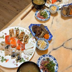 2025年1月3日の夕飯 支度して居たらお隣さんがいらして、要る?と聞いたら欲しいと。 お持ち帰りに。(3枚目の画像分) 棒寿司 紅鮭、塩鯖、刻み鰻 紅鮭のスライスは、通販で柿の葉寿司用の訳あり、冷凍 塩鯖は、コープの冷凍を解凍して酢締め、骨も毛抜きで全て取り除いた。 そしてグリルて焼き鯖に、少し焦げ目をつけて。 刻みうなぎも通販の冷凍、粉山椒も振りかけ。 飛龍頭煮含め、 蒟蒻手綱結び、人参甘煮、 蓮根旨煮、たたき牛蒡 大根なます、落花生入り 葱鮪 永谷園あさげ(夜なのに) ちょっと多かったけど完食。 明日はお昼までオートファジー、16時間空腹生活です。