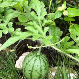 小さな実・スイカ 昨年、孫たちとお庭で🍉を食べ 来年も育ってネ〜🎶 🌱が出てネ〜🎶 と、、、種を飛ばしっこして遊んだ🍉 ツルは3メートル位 先に🟡お花もついてる💕 実が付いただけで・・🥰 ふぞろいの果実🏷 参加します〜(*^▽^*)