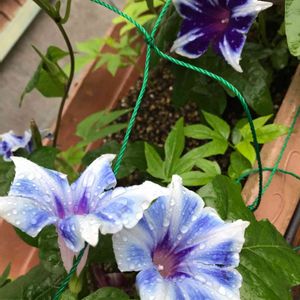 今朝の朝顔 🎶 朝顔スノーフレーク 5月に種蒔きした朝顔ちゃん💕 1本だけ 変わり咲き〜か☀︎な☀︎❣️ 白っぽい朝顔ちゃ〜ん🥰 昨年、娘の家に種を採りに行き冷蔵庫へ保管していました とても嬉しかったので☔️さし📱 覗いて下さり ありがと〜ございます(u_u)ペコリ