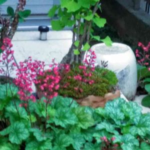 今朝の散策中の出会い、玄関前に、ところ狭しと、置かれている、お花の一部分です。