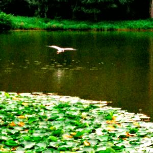 みさと公園の水辺で、アオサギ君を撮ろうと、📱を構えたら、飛び立ってしまいました。