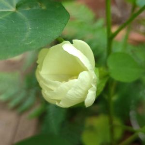春にタネを蒔き 今季一輪目(朝8時) 開花しました🎶 一日花 開花から 夕方まで 花色の変化なし ※自宅 鉢植え🪴※ ワタの花 アオイ科