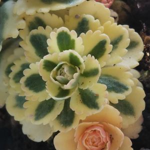 タケシマキリンソウの斑入り品種、セダム・アトランティス( Sedum takesimense 'Atlantis' ('Nonsitnal'))のお花が咲きました😊3月にネット通販で、写真を見て苗を購入した時は、なんという小さな苗だと驚き、育つかどうかも心配だったのですが、もうお花が咲きました😃でも、キリンソウという名からと想像していたよりずっと小さな植物で、ミセバヤくらいしかありません😅多肉はまったく詳しくないので、よくある大柄な麒麟草を想像してました🤣でも、とってもかわいらしくて、このほうが良かった~と思ってます😁