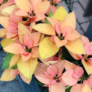 クリスマス用にお迎えしたゴールドとマース(ピンク)のポインセチアで🏷️エンジェル祭りに参加させてくださいね🥰 合言葉はズッキューン💘💘💘💘💘 2色楽しめるmix植えで、 ゴールドは、時間の経過とともにピーチイエローからオレンジイエローに変化します(ღ*ˇᴗˇ*)。o💕