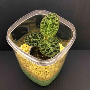 マコデス ジュエルオーキッドさん! わーいわーい🙌 お迎えする事が出来て嬉しいです! 独特な模様になっててキラキラ輝く葉脈を持ち、葉にはつやがありとても魅力的です(≧∇≦) 価格もお手頃価格だったので即買いしました^ ^(低価格➕従業員割引) 本当はガラス瓶でテラリウム的にして楽しみたいですが、ちょうど良いガラス瓶が無いので透明なプラスチックの容器に入れてます^ ^