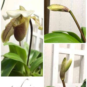 💚開きかけのパフィオ💚 やっと、こんな感じまで進みました。 つぼみが3個出てから、長かった〜( ¨̮ )︎︎♡ 台に上げ、下から何とか撮りました。 夜なので蛍光灯の明かりで少し暗い感じです。 もともと、ジミな色ですが♡♡