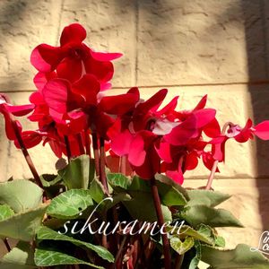 💚赤いシクラメン💚 朝日の中、ポストの上で ちょっぴり夏ツバキの木かげになって 鮮明に咲いています( ¨̮ )︎︎♡