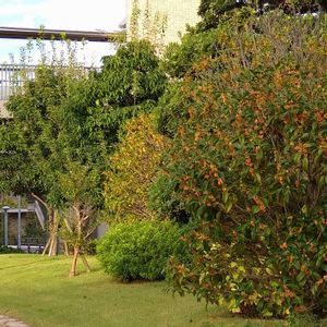 ようやく香った金木犀 ―大阪では、遅かった模様― 月曜日に、我が家のベランダでほのかに金木犀の香りを感じた。GS の皆さんの情報を見ていると他地域では、もっと早く金木犀が花開き芳香を放っていたようだ。大阪はまだかと思っていたが火曜日についによい香りを放つ金木犀に遂に出会った。