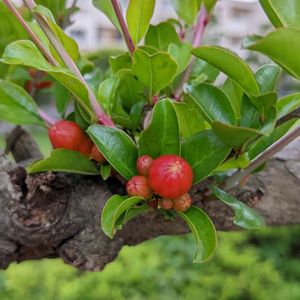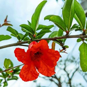 今日は 曇り空 パッとしない天候に 色あざかな朱色の花 緑の葉とのコントラストが素敵 柘榴の花