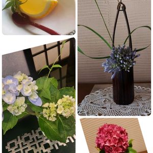 こんにちは👋😃 西日本は 梅雨明けしました。☀️😵💦 我が家のアガパンサスさん少し鉢をずらした 瞬間 ポキポキと茎が折れてしまい 😖💦 可愛そうなので 生けました📱💥 畑に可愛い❤️色合いの紫陽花が咲いていたので 一輪挿しに🤗 先日 素敵な庭園を眺めながら 夏みかんゼリーとお抹茶を頂いて テーブルの紫陽花も綺麗に 癒しの一時でした。😃💕
