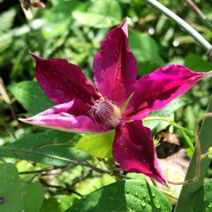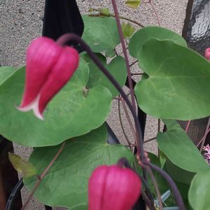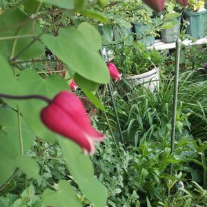 おはようございます😄 一昨日の夜から雨が降ったり止んだり ☔☂️🌂☔☂️🌂☔ 薔薇もクレマチスも次々と開いてきていますがビチョビチョです😅 クレマチス 天使の首飾り** 2019年の秋にお迎えして翌年1輪だけ咲いたけど、そのあと枯れてしまった?と思ったコ・・・ 確か… 昨年春にこれも鉢ごと土に埋め込んだような…🤔 咲いてくれてる⤴️⤴️ ルンルンです(~▽~@)♪♪♪ 《品種説明》 ヴィオルナ系クレマチス 花の外側は濃紫ピンク色の壺形品種。 四季咲き性があり、木立ち性。 うどんこ病にかかりやすい。