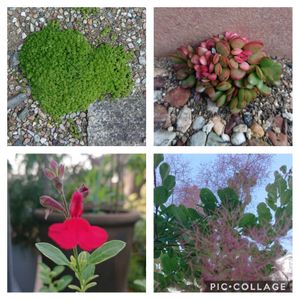 (左上)溢れたセダムが、💚😆 (右上)この子も、溢れた子🎶 誰でしょう⁉️⁉️🤔🤔🤔 (左下)斑入りチェリーセージ✨ 去年大きくなり過ぎたので💦花壇から、植木鉢へ😅 元気に咲いてくれました💕 (右下)レッドスモークツリー✨ 去年咲かなかったので、剪定✂️したら…今年は、元気に咲いてまくれました💕😍