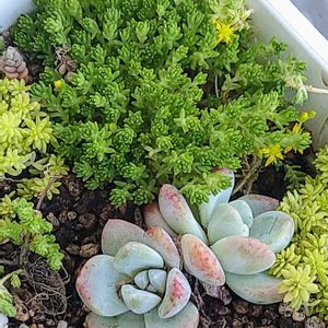 今日の多肉ちゃん。 メルカリから昨日到着のアイスグリーンちゃんとセダムたち❣️ 森村万年草にお花咲いてる🥰
