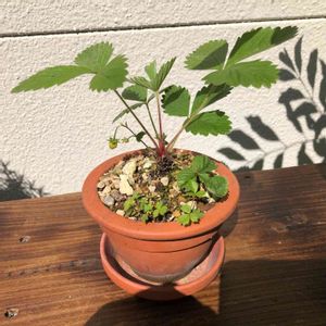 ワイルドストロベリー 完熟した実を埋めてたら 小さな雑草のような新芽が 有りました。 鉢の縁にあるのが新芽🌱です。