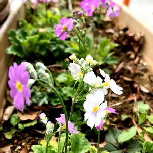 プリムラ マラコイデスかな?芝桜のとなりのプランター♡ 小さいけど沢山出てきました!😊 後方に一本だけムスカリがなぜか咲いてます😅