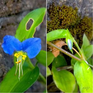 〓夜の投稿便🚚〓 <葉っぱが虫食いに😱> ⬅️ 虫に食われたツユクサ の葉っぱ 上手く穴を開ける Proの仕業😂🤭🙊 ➡️ 蕾って言うのですネ😻🐾 ツユクサは日本を含め、世界中に広く分布する一年草 日当たりがよく、湿気を帯びたところを好みますが、林の縁、畑の土手、道ばた、水辺などでよく自生しています✨🤗✨ 6月から9月にかけて、1~2cmの鮮やかな青い花をつける💙ツユクサ💙 朝に咲いた花は、午後には丸まってしぼんでしまいますが、 このことが、朝露を連想させ、「露草」の名になったとか😅👍 また花を包む苞葉が、編み笠を二つ折りに畳んだような形から、別名は帽子草(ぼうしぐさ) ありふれた野草ですが、近づいてよく見ますと、特徴ある姿で見る人の関心を惹きつけます✨🤗✨ 花のつぼみは、この帽子(苞葉)の中にあって、 早朝になると帽子の外に顔を出しては開花していきますネ😻🐾😆⤴️💓👍️