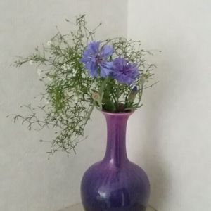 お墓参りの帰り道、つゆ草を道端で見つけてビックリ‼️ つゆ草2つが1カ所から咲いていました。 家に帰って、ガラス瓶に生けました。💙