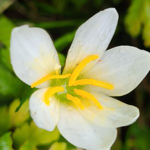 こんにちは👋😃 雨が、また、降り続いています。 ゼフィランサス白 2年目の4号鉢 ひとつ咲きました。 小さな鉢に、そのままで、放置していて、咲いてくれたから、気付きました。 スプレー菊セザンヌの鉢の横で咲いてました。
